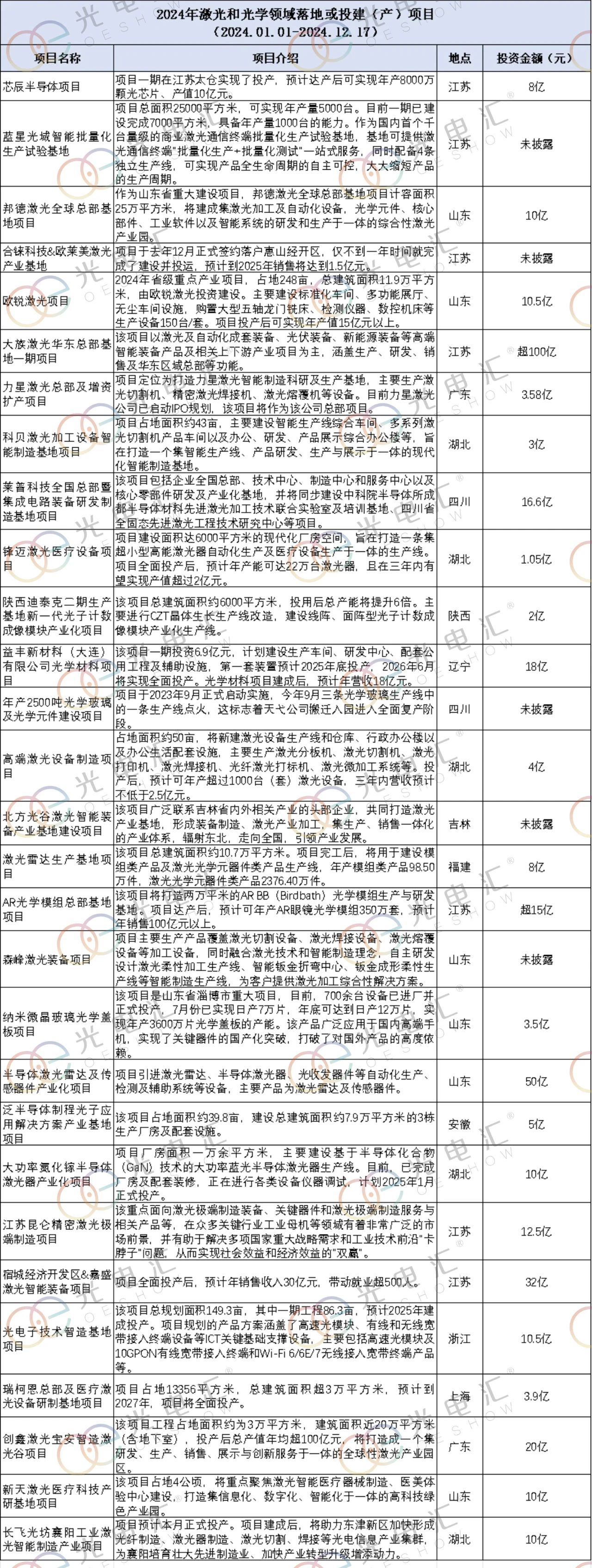 據光電匯不完全統計,2024年,共有29個激光和光學相關的項目落地、投建或啟用,其中,24個項目公布了投資金額,總投資超367億。