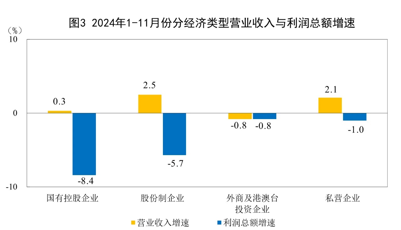 1—11月份,規模以上工業企業中,國有控股企業實現利潤總額20387.7億元,同比下降8.4%;股份制企業實現利潤總額50143.0億元,下降5.7%;外商及港澳臺投資企業實現利潤總額16062.9億元,下降0.8%;私營企業實現利潤總額19649.1億元,下降1.0%。