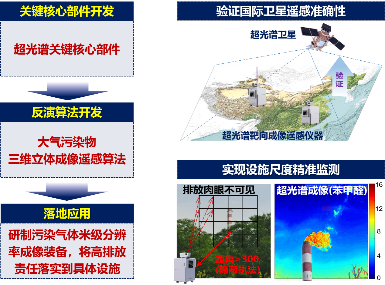團隊通過一系列關鍵部件和技術突破,使超光譜靶向成像裝備同時實現了污染源靶向成像、多組分氣體水平與垂直成像功能,推動了我國自主可控的大氣環境超光譜立體遙感技術創新,為我國降碳減污工作提供了必不可少的新技術和新裝備支撐。