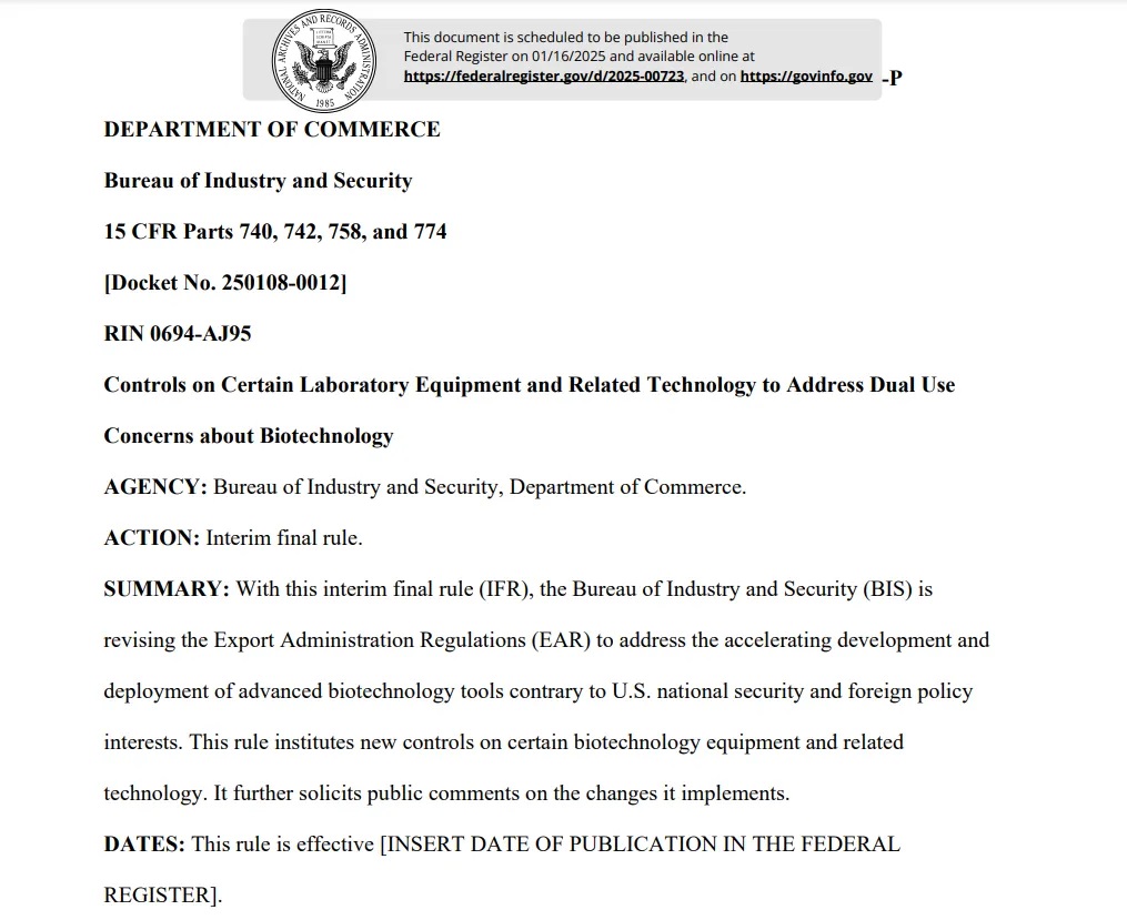 2025年1月15日,美國商務部工業(yè)與安全局(BIS)發(fā)布一項新的出口管制規(guī)定,對《出口管理條例》(EAR)進行修訂,以應對生物技術領域的“兩用性“問題。該規(guī)則對某些生物技術設備及相關技術實施了新的管控措施,并就這些變更征求公眾意見。