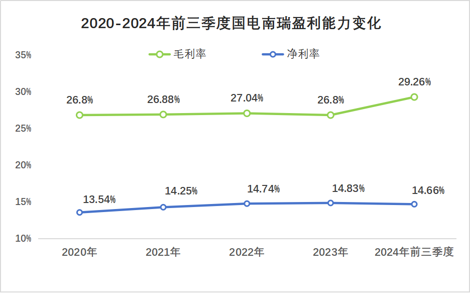2020到2024年前三季度,國電南瑞毛利率從26.8%提高到29.26%,凈利率從13.54%提高到14.66%。