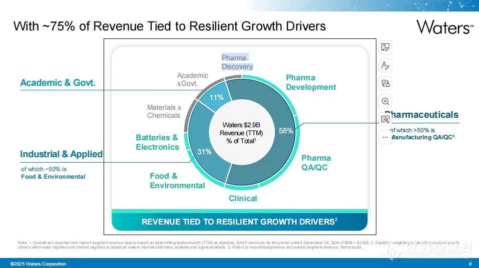 Batra指出,Waters專注于監(jiān)管嚴(yán)格且需求尚未被充分滿足的市場,市場總體規(guī)模約為120億美元,并以中個(gè)位數(shù)的速度穩(wěn)定增長。在生命科學(xué)領(lǐng)域,制藥行業(yè)的長期增速約為高個(gè)位數(shù),主要得益于新型治療方法和生物制劑的推動(dòng);而臨床領(lǐng)域同樣以高個(gè)位數(shù)增長,重點(diǎn)聚焦特定臨床細(xì)分市場,尤其是質(zhì)譜技術(shù)在早期疾病檢測和小分子分析中的應(yīng)用。此外,在工業(yè)與應(yīng)用領(lǐng)域(包括食品和環(huán)境市場),增長率約為中個(gè)位數(shù),受全球人口增長以及對(duì)安全食品和清潔水源需求的推動(dòng);同時(shí),PFAS(全氟和多氟化合物)檢測需求及減少食品和環(huán)境中雜質(zhì)的趨勢也帶來了新的增長機(jī)遇。材料領(lǐng)域的增速為中個(gè)位數(shù),近期受經(jīng)濟(jì)電氣化進(jìn)程加速的推動(dòng),尤其是電動(dòng)車需求的增加表現(xiàn)出更強(qiáng)勁的增長。而學(xué)術(shù)與政府領(lǐng)域作為最小的終端市場,其長期增速為低個(gè)位數(shù),主要依賴政府撥款支持。