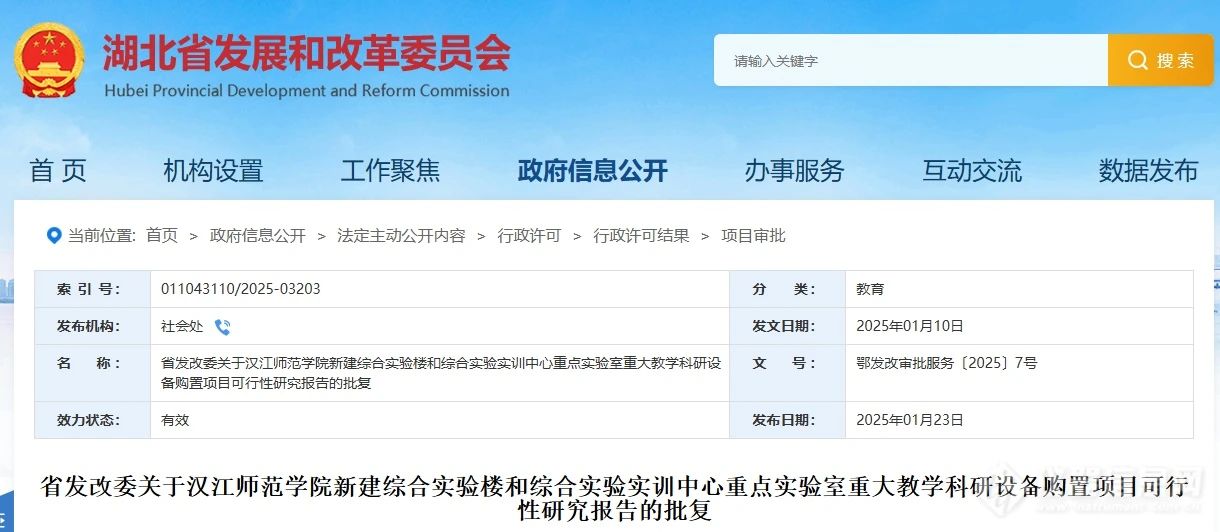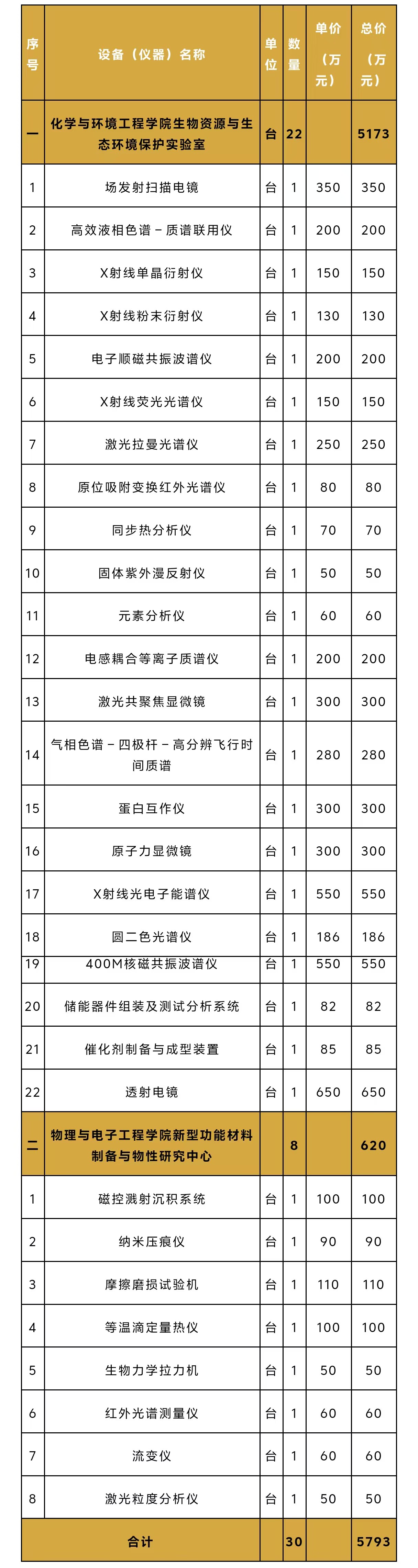 日前,湖北省發(fā)展和改革委員會(huì)發(fā)布了《關(guān)于漢江師范學(xué)院新建綜合實(shí)驗(yàn)樓和綜合實(shí)驗(yàn)實(shí)訓(xùn)中心重點(diǎn)實(shí)驗(yàn)室重大教學(xué)科研設(shè)備購置項(xiàng)目可行性研究報(bào)告的批復(fù)》。該項(xiàng)目總投資5793萬元,用于重大科研儀器設(shè)備購置,資金來源為除爭(zhēng)取中央投資外,其余由學(xué)校自籌解決。擬更新設(shè)備共30臺(tái)(套)【清單表附表】,其中化學(xué)與環(huán)境工程學(xué)院生物資源與生態(tài)環(huán)境保護(hù)實(shí)驗(yàn)室更新設(shè)備22臺(tái)(套)、物理與電子工程學(xué)院新型功能材料制備與物性研究中心更新設(shè)備8臺(tái)(套)。淘汰同品目設(shè)備38臺(tái)(套)。