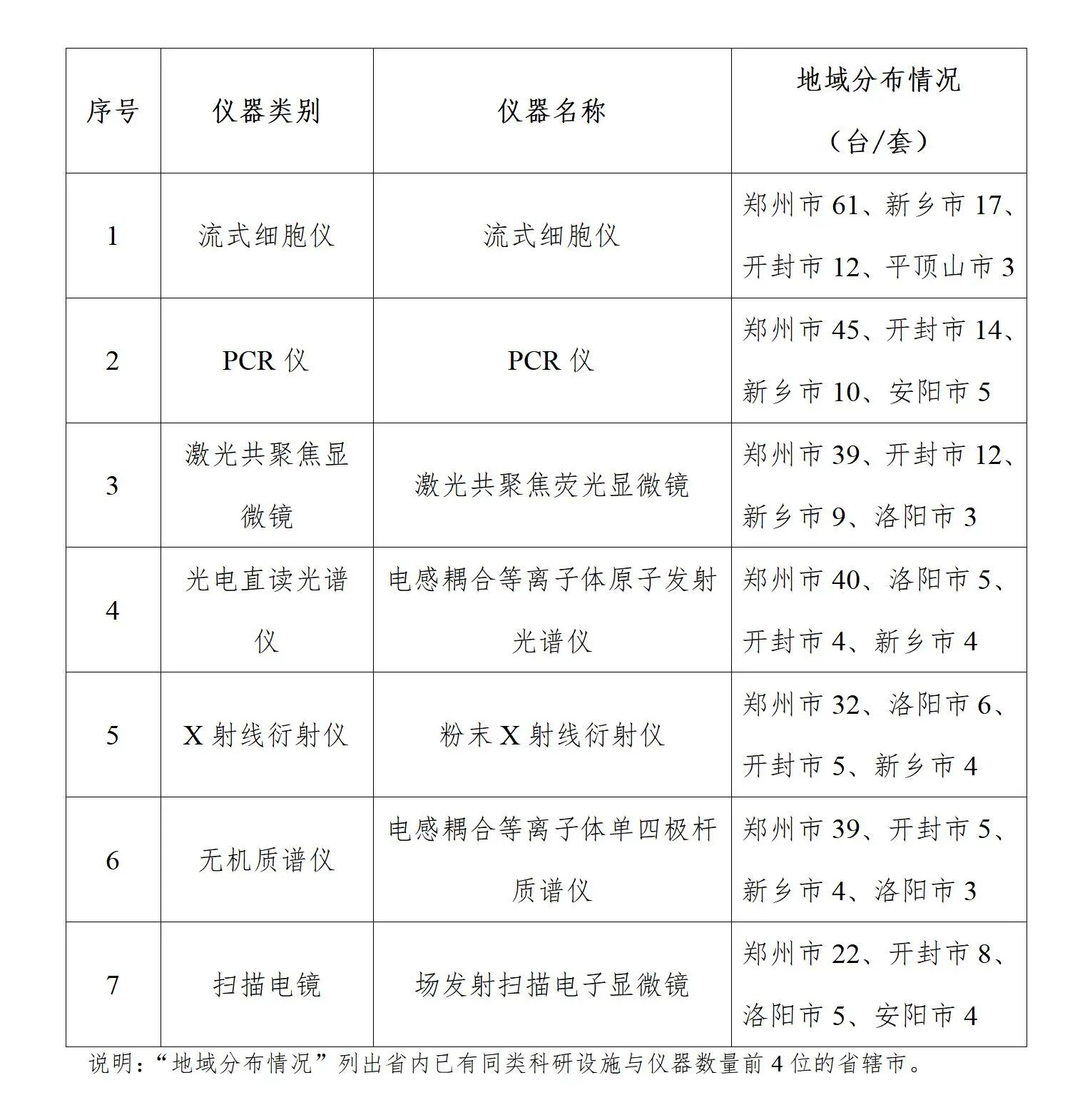 為貫徹落實《國務院關于國家重大科研基礎設施和大型科研儀器向社會開放的意見》(國發(fā)〔2014〕70號)、《河南省人民政府關于促進重大科研基礎設施和大型科研儀器向社會開放的實施意見》(豫政〔2016〕56號)有關要求,從源頭控制大型科研設施與儀器重復購置,提高大型科研設施與儀器利用率和財政資金使用效益。省科技廳、省財政廳、省教育廳、省衛(wèi)生健康委依據(jù)2024年我省大型科研設施與儀器資源調(diào)查數(shù)據(jù),在綜合分析價值50萬元及以上大型科研設施與儀器總量、年平均運行機時、地域分布等多種要素的基礎上,組織專家對全省擁有數(shù)量較多但利用率不高的大型科研設施與儀器進行分析論證,編制了《河南省省級新購大型科研設施與儀器預警目錄》(以下簡稱預警目錄,見附件),現(xiàn)予以發(fā)布。