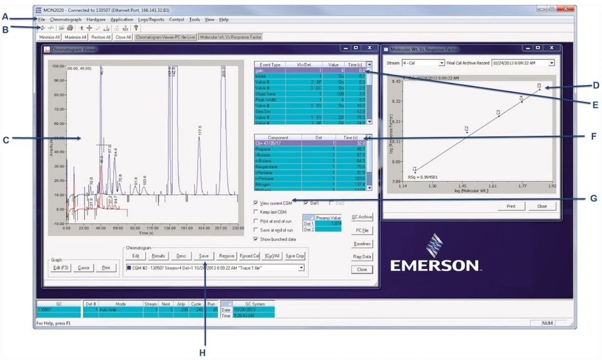 ▲圖4:氣相色譜儀軟件應包括以下功能:a)簡單的下拉菜單,b)訪問多個氣相色譜儀,c)完整的測量顯示,d)響應因子,e)定時事件表,f)組件列表,g)疊加讀取存檔讀數,h)保存到硬盤的功能。