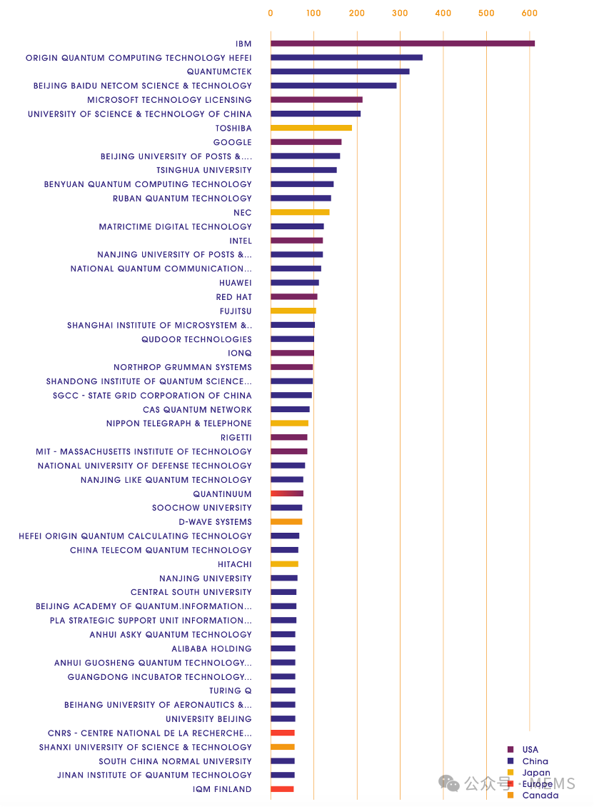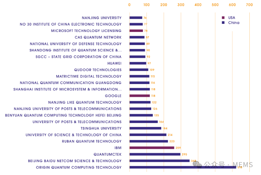 在中國申請的量子技術(shù)專利按申請量排名,前25位專利申請人中,除了三家來自美國的申請人(IBM、谷歌和微軟),其他全部為中國本土機構(gòu),包括本源量子計算科技(合肥)股份有限公司、北京百度網(wǎng)訊科技有限公司、科大國盾量子技術(shù)股份有限公司、如班量子科技有限公司、中國科學(xué)技術(shù)大學(xué)、清華大學(xué)、北京郵電大學(xué)及南京郵電大學(xué)等。
