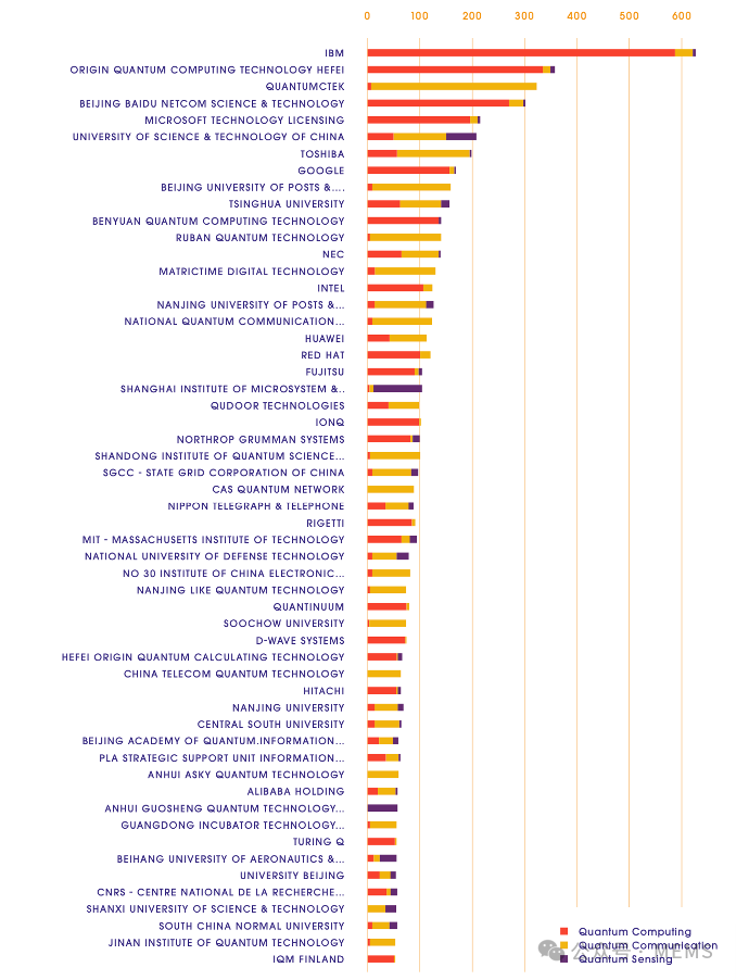 按技術(shù)類型細分,來自中國排名前三的機構(gòu),本源量子計算科技(合肥)股份有限公司和北京百度網(wǎng)訊科技有限公司主要聚焦量子計算技術(shù),科大國盾量子技術(shù)股份有限公司則主要聚焦量子通信技術(shù)。在量子傳感技術(shù)領(lǐng)域有大量專利布局的中國機構(gòu)有:中國科學(xué)技術(shù)大學(xué)、中國科學(xué)院上海微系統(tǒng)與信息技術(shù)研究所、安徽省國盛量子科技有限公司以及北京航空航天大學(xué)等。