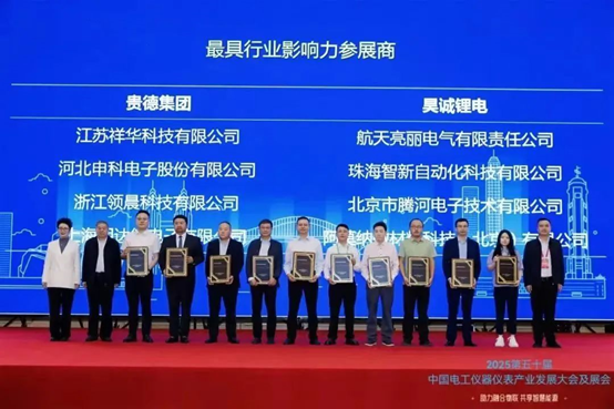 展會規??涨?,參會人數400余人,近200家參展企業展示了傳感器、電容器、開關與繼電器等產品。采用 “以會帶展、以展促會” 模式,打通電工儀器儀表行業全產業鏈條,推動各環節緊密銜接與協同發展。今年恰逢第50屆行業大會,為彰顯會議的特殊意義和重要貢獻,特別舉辦了“最具行業影響力展商”評選活動,評選出貴德集團等十家行業內最具代表性的品牌企業。工業和信息化部裝備工業一司原一級巡視員、中國儀器儀表行業協會九屆理事會副理事長候選人(駐會)苗長興,中國儀器儀表行業協會副秘書長程紅,以及哈爾濱電工儀表研究所有限公司黨委書記、董事長趙斌為這10家最具影響力的參展商隆重授牌。