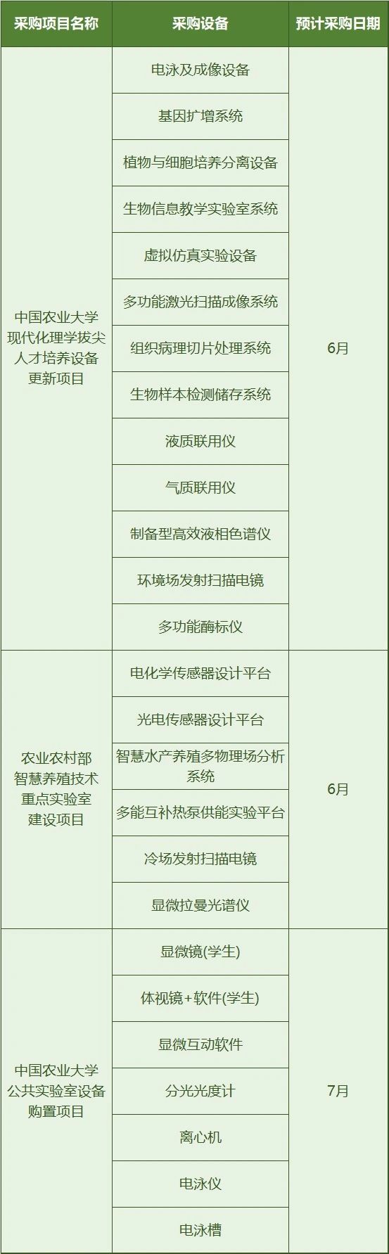 近日,中國農業大學發布一批政府采購意向,包括現代化理學拔尖人才培養設備更新項目、農業農村部智慧養殖技術重點實驗室建設項目、公共實驗室設備購置項目等,預算達9186.5萬元。