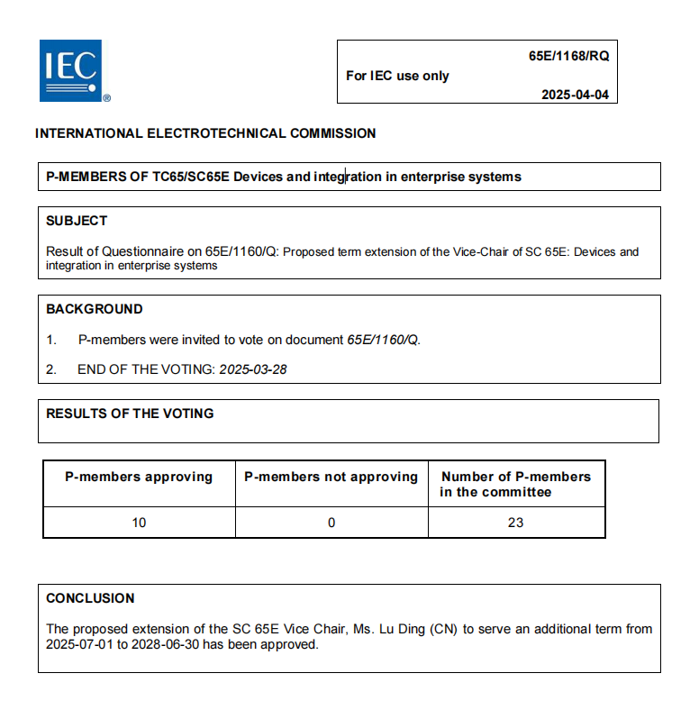 2024年4月,國際電工委員會企業(yè)設(shè)備與系統(tǒng)集成分委員會(IEC/SC65E)正式宣布,機械工業(yè)儀器儀表綜合技術(shù)經(jīng)濟研究所(以下簡稱儀綜所)標(biāo)準(zhǔn)與檢測中心主任丁露博士以100%贊成率成功連任IEC/SC65E副主席,任期為2025年7月1日至2028年6月30日。