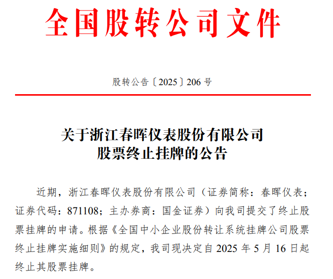 2025 年 5 月 13 日,全國中小企業(yè)股份轉(zhuǎn)讓系統(tǒng)有限責(zé)任公司發(fā)布股轉(zhuǎn)公告〔2025〕206 號,宣布浙江春暉儀表股份有限公司(證券簡稱:春暉儀表)向其提交了終止股票掛牌的申請。依據(jù)《全國中小企業(yè)股份轉(zhuǎn)讓系統(tǒng)掛牌公司股票終止掛牌實施細(xì)則》規(guī)定,全國股轉(zhuǎn)公司決定自 2025 年 5 月 16 日起終止春暉儀表股票掛牌。