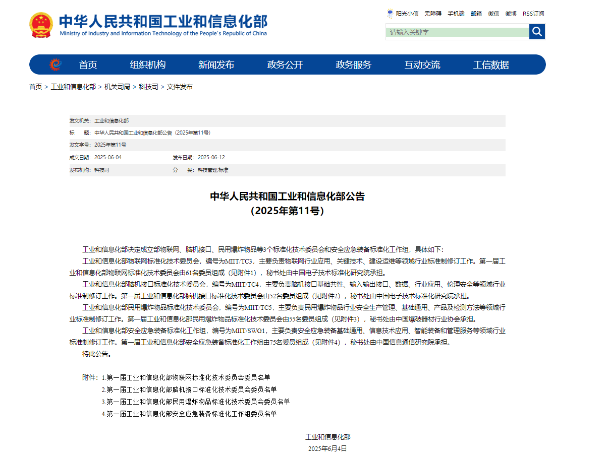 6月12日,工業(yè)和信息化部發(fā)布重要公告,宣布成立物聯(lián)網(wǎng)、腦機(jī)接口、民用爆炸物品三個標(biāo)準(zhǔn)化技術(shù)委員會以及安全應(yīng)急裝備標(biāo)準(zhǔn)化工作組。這一舉措旨在進(jìn)一步規(guī)范相關(guān)領(lǐng)域的行業(yè)標(biāo)準(zhǔn),促進(jìn)技術(shù)創(chuàng)新與產(chǎn)業(yè)升級,提升我國在全球市場的競爭力。
