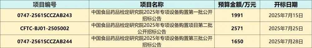 中國政府采購網(wǎng)消息,近日,中國食品藥品檢定研究院就2025年專項設(shè)備購置項目分別于6月24日和7月4日發(fā)布招標(biāo)公告,招標(biāo)總金額為6212萬元,采購的儀器設(shè)備共計605臺/套,包括超高效液相色譜儀、生物熒光微生物快檢系統(tǒng)、小動物活體成像系統(tǒng)等。