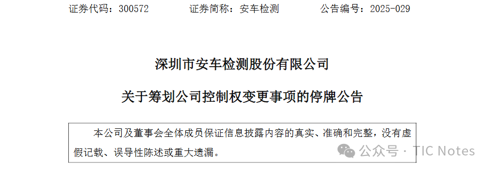 2025年7月29日,深圳市安車檢測股份有限公司發(fā)布《關(guān)于籌劃公司控制權(quán)變更事項的停牌公告》,公告顯示,公司于今日收到控股股東及實際控制人賀憲寧的通知,其正在籌劃股權(quán)轉(zhuǎn)讓及控制權(quán)變更相關(guān)事宜,該事項可能導(dǎo)致公司控股股東和實際控制人發(fā)生變更。目前各方尚未簽署相關(guān)正式交易協(xié)議,擬就具體交易方案、協(xié)議等相關(guān)事項進行論證和磋商,具體情況以各方簽訂的相關(guān)正式交易協(xié)議為準。
