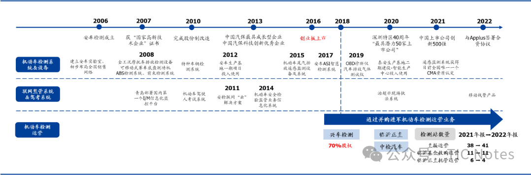 據(jù)悉,安車檢測成立于2006年,2010年完成股份制改造,2016年于創(chuàng)業(yè)板上市。公司為機動車檢測綜合服務(wù)商,業(yè)務(wù)覆蓋全國31個省市,初期主業(yè)圍繞機動車檢測系統(tǒng)及檢測行業(yè)聯(lián)網(wǎng)監(jiān)管系統(tǒng),為業(yè)內(nèi)少數(shù)可提供系統(tǒng)方案設(shè)計、安裝集成、運營維護及行業(yè)監(jiān)管等全鏈條服務(wù)的檢測設(shè)備供應(yīng)商之一,下游客戶主要包括全國各地的機動車檢驗機構(gòu)、汽車制造廠、科研機構(gòu)等。2018年公司通過收購興車檢測70%股權(quán)切入機動車檢測站運營,加速向下游產(chǎn)業(yè)鏈延伸,產(chǎn)業(yè)鏈布局持續(xù)完善。