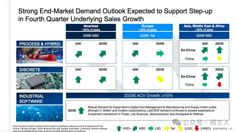 (注:Process & Hybrid includes Control Systems & Software, Measurement & Analytical and FinalControl. Discrete includes Test & Measurement and Discrete Automation. Underlying industrial software sales are embedded within regional and end-market performances and outlooks.)