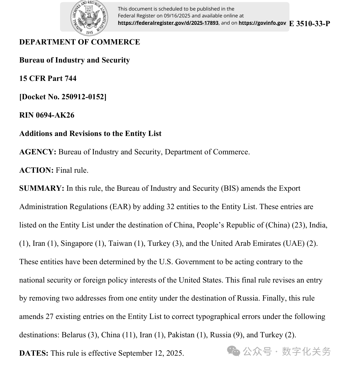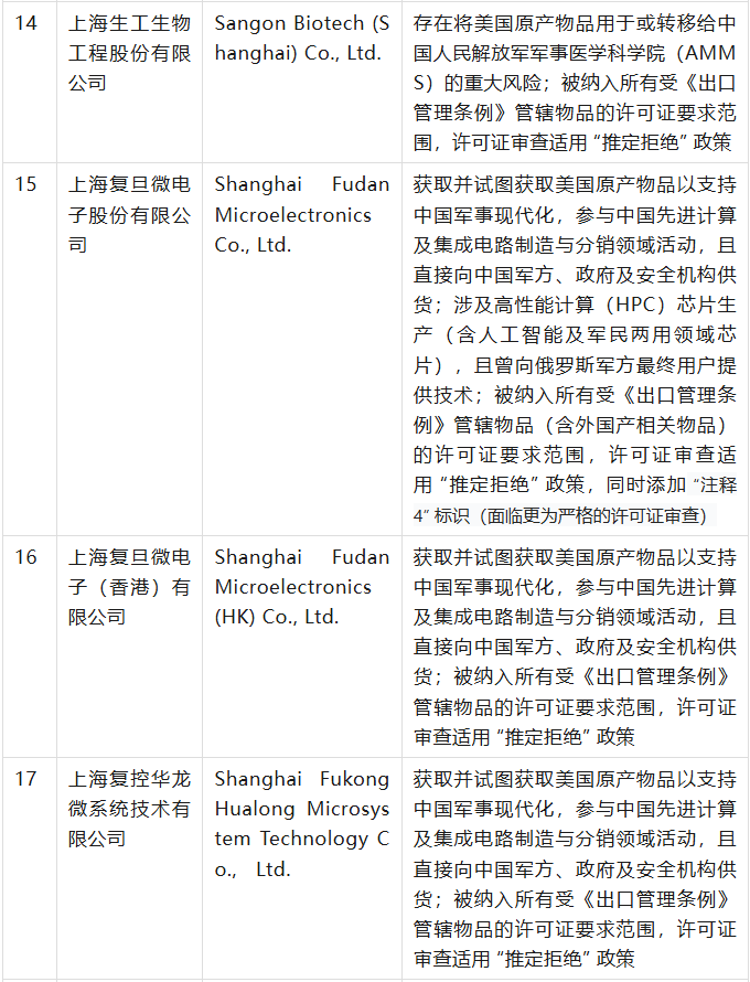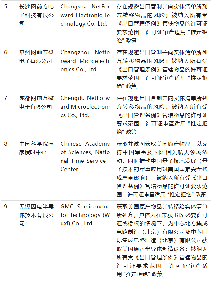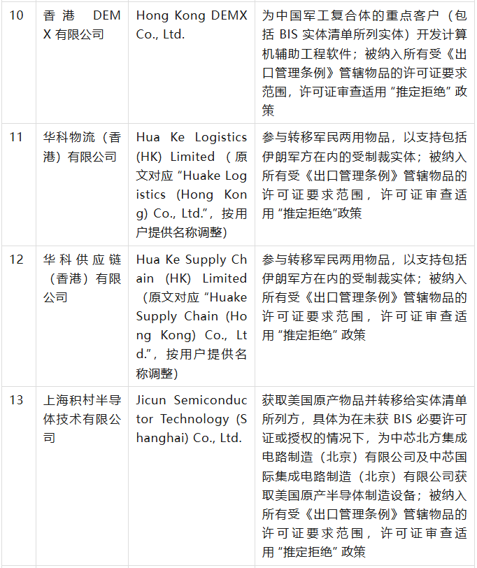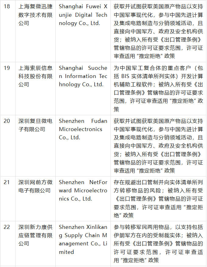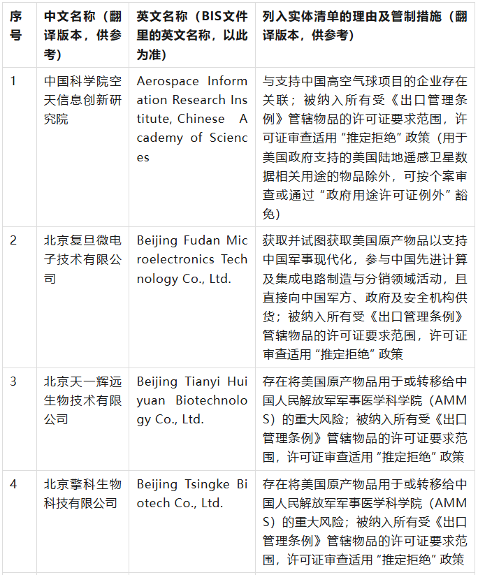 美國商務(wù)部工業(yè)與安全局(BIS)于9月12日在美國聯(lián)邦公報(bào)發(fā)布公告,通過修訂《出口管理?xiàng)l例》(EAR),將 32 家實(shí)體新增至實(shí)體清單,其中有23家是中國公司,具體清單、列入實(shí)體清單的理由及管制措施如下表(表中提及的列入實(shí)體清單的理由為BIS方面指認(rèn),不代表本號(hào)對(duì)該理由或相關(guān)事實(shí)的認(rèn)可):
