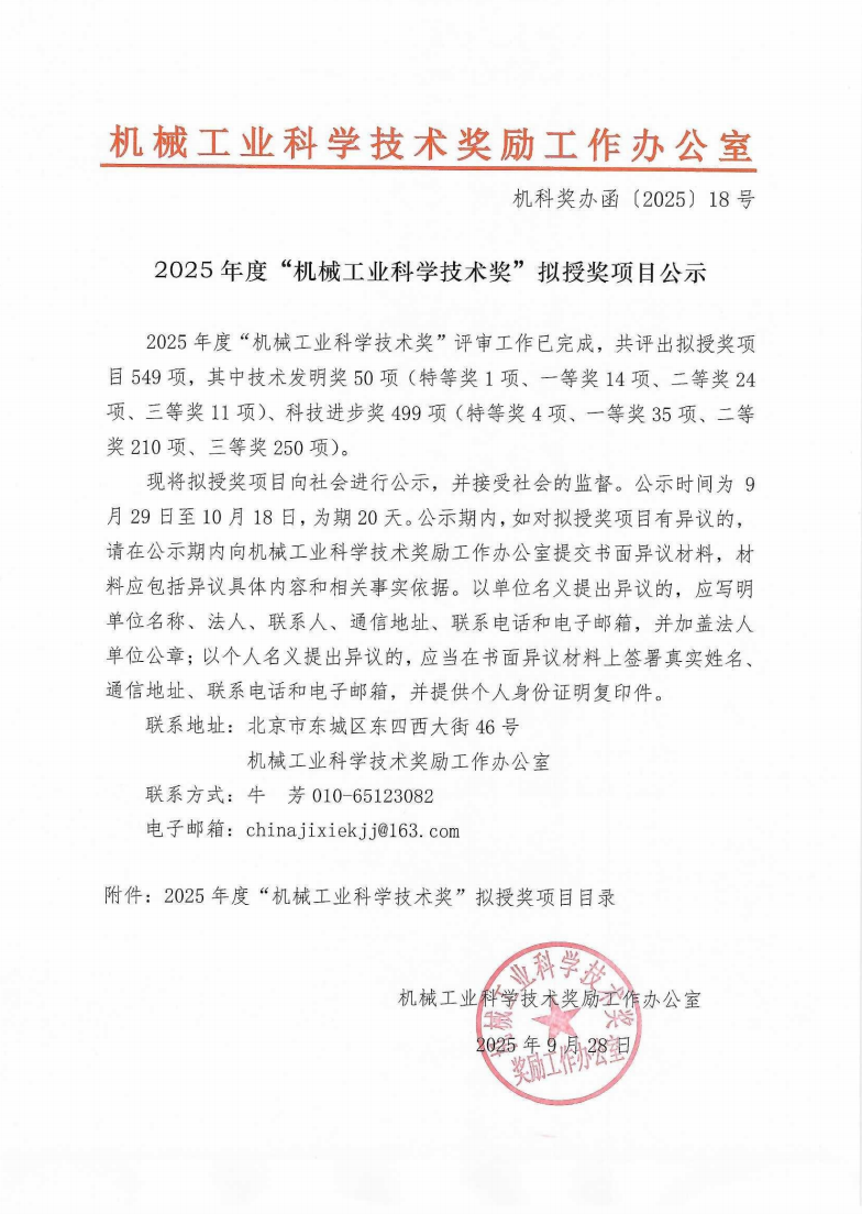 2025年度“機械工業科學技術獎”評審工作已完成,共評出擬授獎項目549項,其中技術發明獎50項(特等獎1項、一等獎14項、二等獎24項、三等獎11項)、科技進步獎499項(特等獎4項、一等獎35項、二等獎210項、三等獎250項)。
