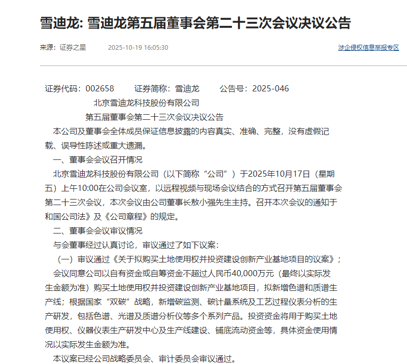 10月19日晚間,北京雪迪龍科技股份有限公司(股票代碼:002658)發(fā)布一則重磅公告,擬投資不超過4億元,購買位于北京市昌平區(qū)的國有建設(shè)用地使用權(quán)并建設(shè)包括色譜和質(zhì)譜生產(chǎn)線的創(chuàng)新產(chǎn)業(yè)基地項(xiàng)目。