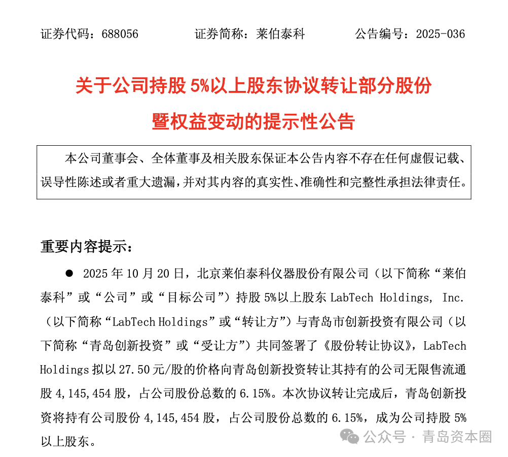 10月21日,北京萊伯泰科儀器股份有限公司(股票代碼:688056,簡稱 “萊伯泰科”)發布公告稱,公司股東LabTech Holdings, Inc.(以下簡稱 “LabTech Holdings” )與青島市創新投資有限公司共同簽署了《股份轉讓協議》,LabTech Holdings擬以27.50元/股的價格向青島創新投資轉讓其持有的公司無限售流通股414.55萬股,占公司股份總數的 6.15%。本次協議轉讓完成后,青島創新投資將持有公司股份414.55萬股,占公司股份總數的6.15%,成為公司持股5%以上股東。