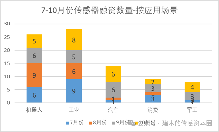 從融資數(shù)量上看,工業(yè)、汽車、機器人數(shù)量居于前三位,分別是8家、6家、5家,合計占比80%。本月機器人數(shù)量略有下滑,汽車領(lǐng)域的傳感器融資數(shù)量明顯恢復(fù)。