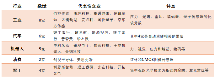 工業(yè)領(lǐng)域的項目仍然比較分散,壓力、光譜、雷達等產(chǎn)品都有涉及;汽車領(lǐng)域應(yīng)用比較集中,大部分集中在與自動駕駛相關(guān)的傳感器上;機器人不再像以前的六維力和觸覺那樣集中,投資人開始關(guān)注不同的傳感器類型了。