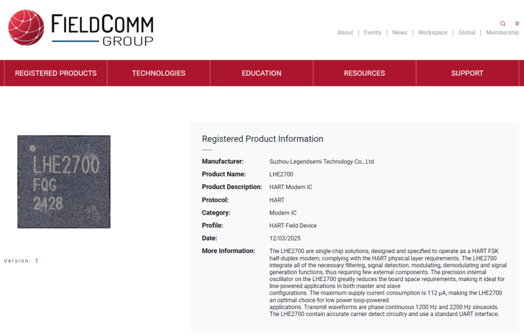 近日,領(lǐng)慧立芯旗下LHE2700 集成精密振蕩器的低功耗 HART 調(diào)制解調(diào)器,成功通過(guò)國(guó)際權(quán)威機(jī)構(gòu) FieldComm Group 的 HART® 通信協(xié)議認(rèn)證。這一里程碑式的突破,不僅標(biāo)志著 LHE2700 在工業(yè)通信協(xié)議兼容性、技術(shù)可靠性上達(dá)到國(guó)際標(biāo)準(zhǔn),更意味著國(guó)產(chǎn)工業(yè)級(jí)模擬芯片在關(guān)鍵領(lǐng)域?qū)崿F(xiàn)了與國(guó)際先進(jìn)水平的精準(zhǔn)對(duì)標(biāo),為工業(yè)自動(dòng)化設(shè)備的國(guó)產(chǎn)化升級(jí)注入強(qiáng)勁 “芯” 動(dòng)力。