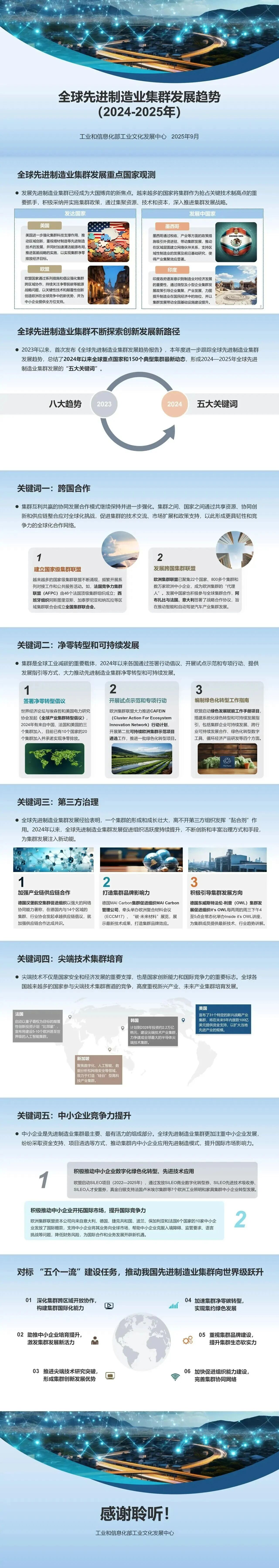 先進制造業集群是制造業高質量發展的核心趨勢,也是制造強國戰略布局的關鍵重點,對推進新型工業化、保障產業鏈供應鏈安全、構筑大國經濟安全屏障具有重要意義。黨中央、國務院高度重視其培育發展,習近平總書記作出系列重要指示,黨的二十屆三中全會也提出明確要求。在新一輪科技革命和產業變革深入演進、全球產業鏈供應鏈加速重構的背景下,課題組以全球 150 個典型集群為跟蹤樣本,延續往年研究基礎,梳理 2024 年以來全球重點國家及集群最新動態,提煉出五大年度關鍵詞,并形成我國集群培育提升的相關建議,為政府、相關組織及企業提供參考。