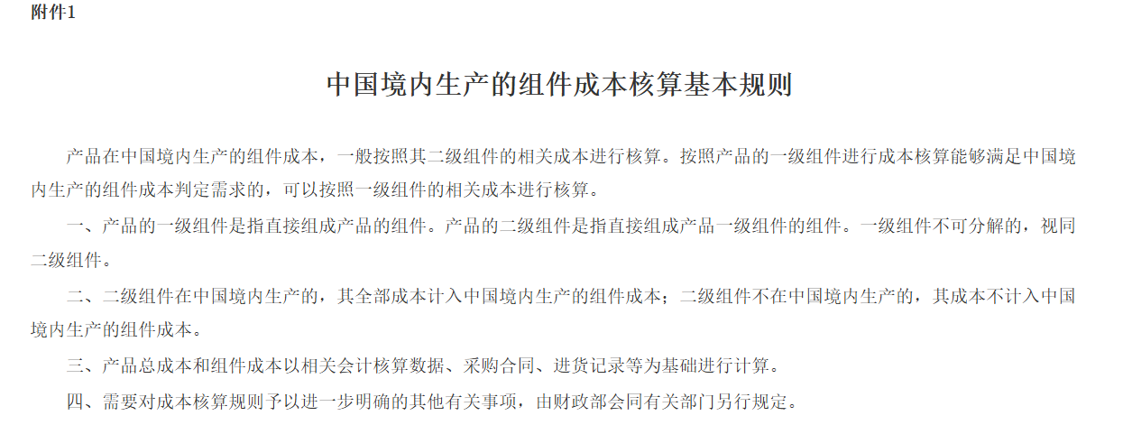 (二)在中國(guó)境內(nèi)生產(chǎn)的組件成本占比達(dá)到規(guī)定比例