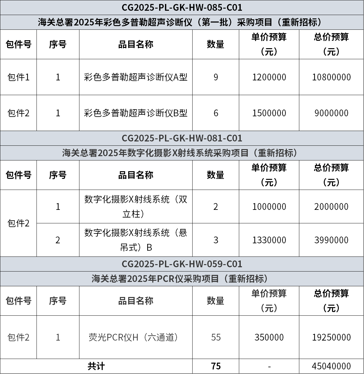 近日,海關(guān)總署物資裝備采購(gòu)中心發(fā)布多則公告,分別就“海關(guān)總署2025年數(shù)字化攝影X射線系統(tǒng)采購(gòu)項(xiàng)目(重新招標(biāo))”“海關(guān)總署2025年PCR儀采購(gòu)項(xiàng)目(重新招標(biāo))”“海關(guān)總署2025年彩色多普勒超聲診斷儀(第一批)采購(gòu)項(xiàng)目(重新招標(biāo))”進(jìn)行國(guó)內(nèi)公開招標(biāo)采購(gòu)。