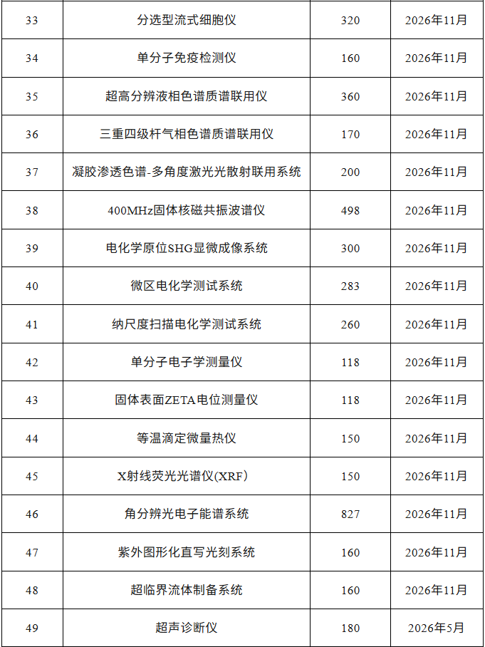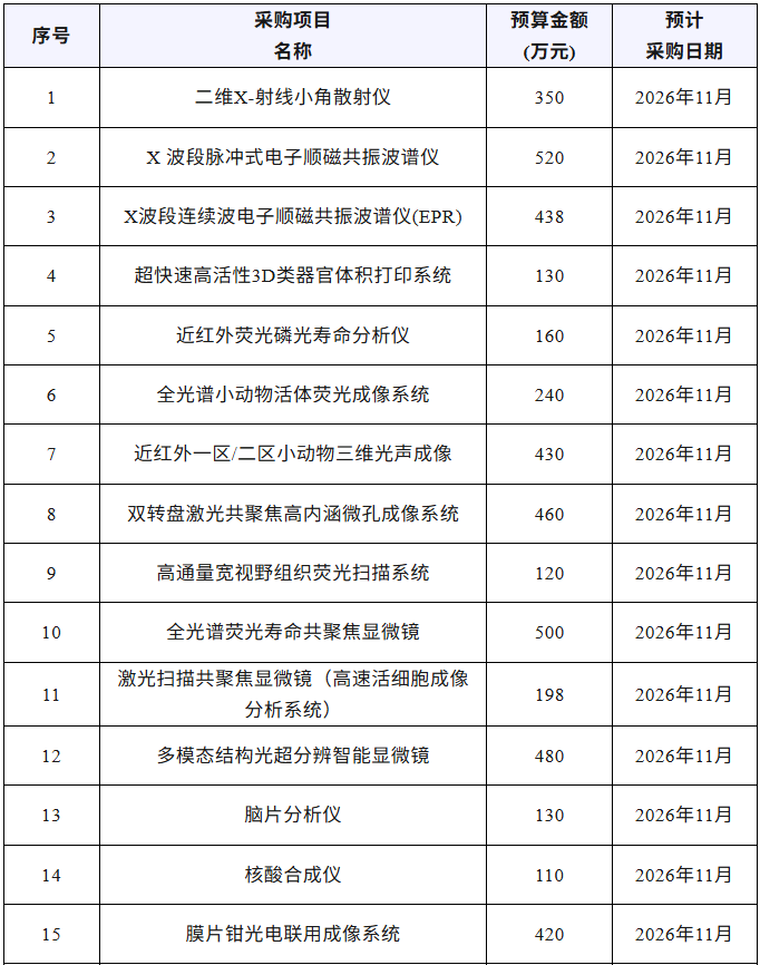 近期,湖南大學發(fā)布多項儀器采購項目,擬采購二維X-射線小角散射儀、X 波段脈沖式電子順磁共振波譜儀、全光譜熒光壽命共聚焦顯微鏡、核酸合成儀、場發(fā)射透射電子顯微鏡、電感耦合等離子體質譜儀、超高分辨液相色譜質譜聯(lián)用儀等儀器設備,預算總金額13641.8萬元,預計采購時間2026年1月~11月。