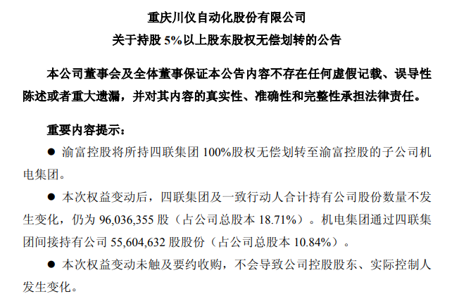 近日,公司收到四聯集團轉發的重慶市國資委《關于同意重慶渝富控股集團有限公司無償劃轉所持中國四聯儀器儀表集團有限公司100%股權的批復》,同意渝富控股以2025年12月31日為基準日,將持有四聯集團100%股權無償劃轉至機電集團。本次權益變動完成后,前述《委托管理協議》終止,機電集團由受托管理四聯集團,變更為直接持有四聯集團100%股權,并通過四聯集團間接持有公司10.84%股份,本次權益變動不涉及四聯集團及其一致行動人合計持有公司股份數量的變化。