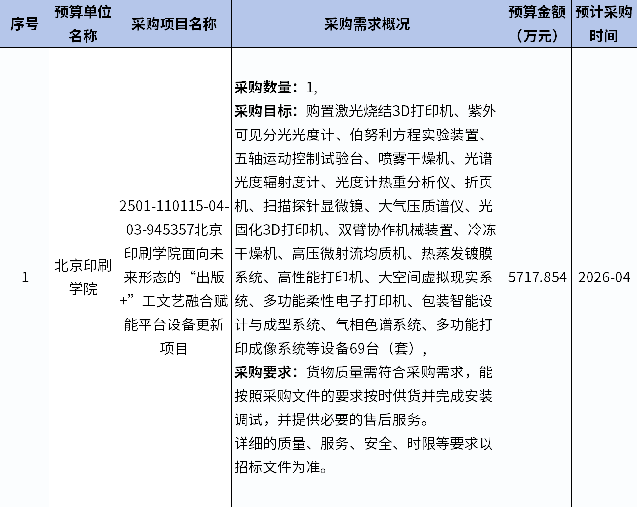 北京印刷學院面向未來形態的“出版+”工文藝融合賦能平臺設備更新項目公開,計劃購置激光燒結3D打印機、紫外可見分光光度計、伯努利方程實驗裝置、五軸運動控制試驗臺、噴霧干燥機、光譜光度輻射度計等69臺(套)設備,預算金額5717.854萬元,預計20264月采購。