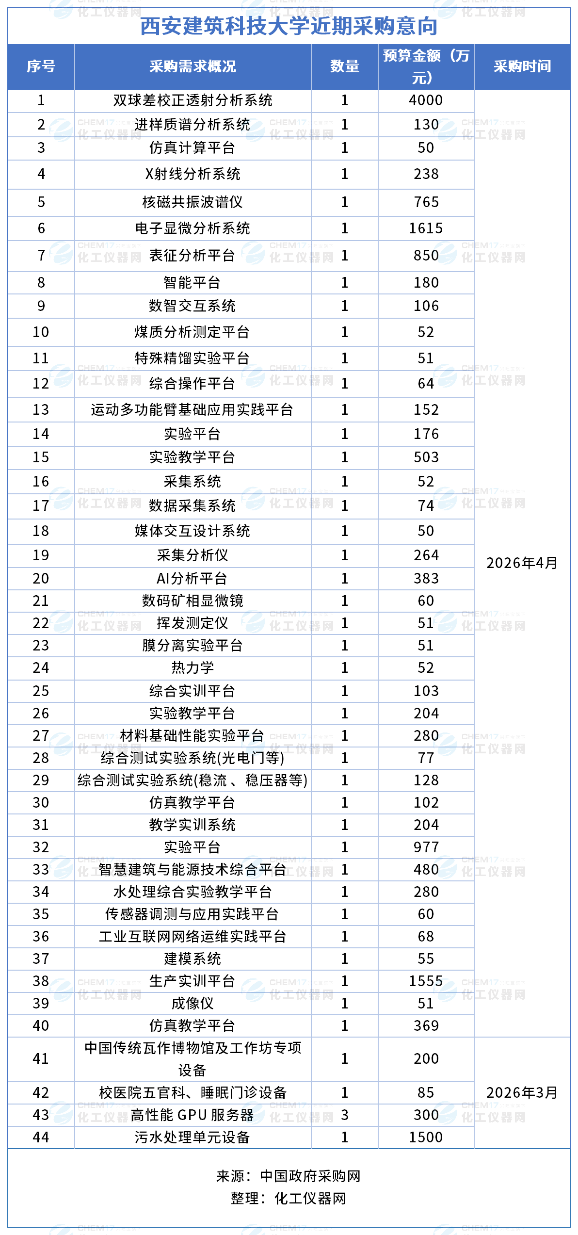近期,西安建筑科技大學(xué)發(fā)布多項(xiàng)儀器采購意向,采購預(yù)算金額17047萬元,涉及儀器設(shè)備包括雙球差校正透射分析系統(tǒng)、進(jìn)樣質(zhì)譜分析系統(tǒng)、仿真計算平臺、X射線分析系統(tǒng)、核磁共振波譜儀、電子顯微分析系統(tǒng)等。預(yù)計采購時間2026年3月-4月。
