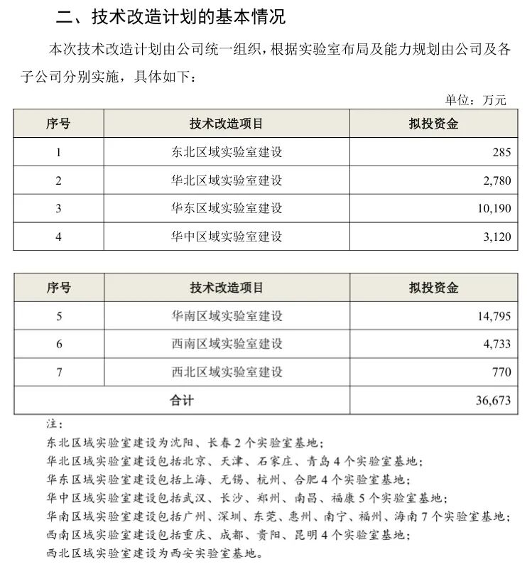 本次技術改造計劃由公司統一組織,根據實驗室布局及能力規劃由公司及各子公司分別實施,在全國七大區域(東北、華北、華東、華中、華南、西南、西北)的合計27個實驗室基地分別實施。