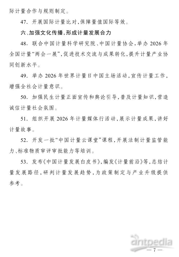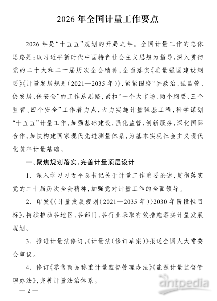 2026年,全國計量工作主要圍繞六個方面開展:聚焦規(guī)劃落實,完善計量頂層設計;加強基礎建設,提升計量保障能力;創(chuàng)新監(jiān)管模式,守牢計量公正底線;圍繞戰(zhàn)略需求,優(yōu)化計量服務支撐;深化國際合作,推動計量高水平對外開放;加強文化傳播,形成計量發(fā)展合力。具體包括推進計量法修訂,圍繞新技術、新產(chǎn)業(yè)、新業(yè)態(tài)建設一批計量技術委員會等內(nèi)容。