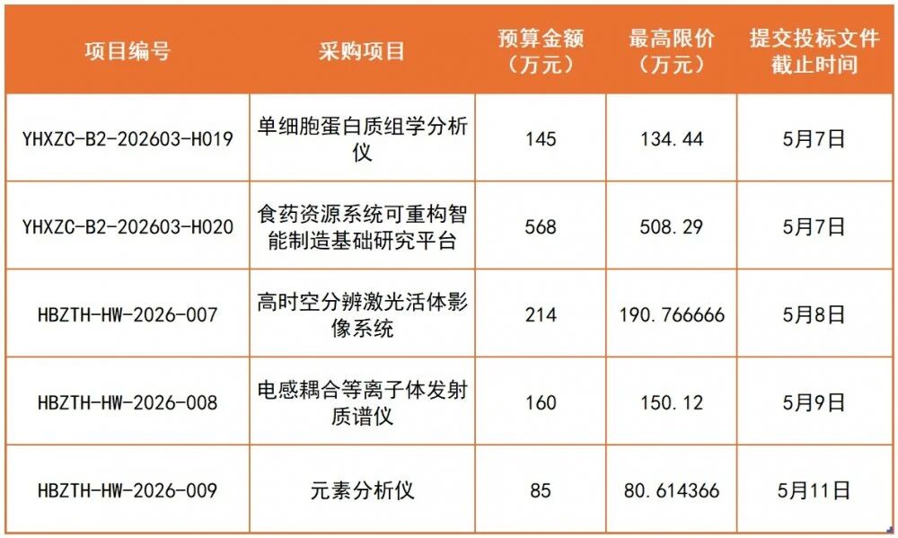 近日,武漢輕工大學生科院大型儀器設備平臺設備更新項目項目已正式啟動公開招標。本次采購涵蓋單細胞蛋白質(zhì)組學分析儀、食藥資源系統(tǒng)可重構(gòu)智能制造基礎研究平臺、高時空分辨激光活體影像系統(tǒng)、電感耦合等離子體發(fā)射質(zhì)譜儀及元素分析儀等多套高端科研設備,整體預算金額達1172萬元,項目最早投標截止時間為5月7日。