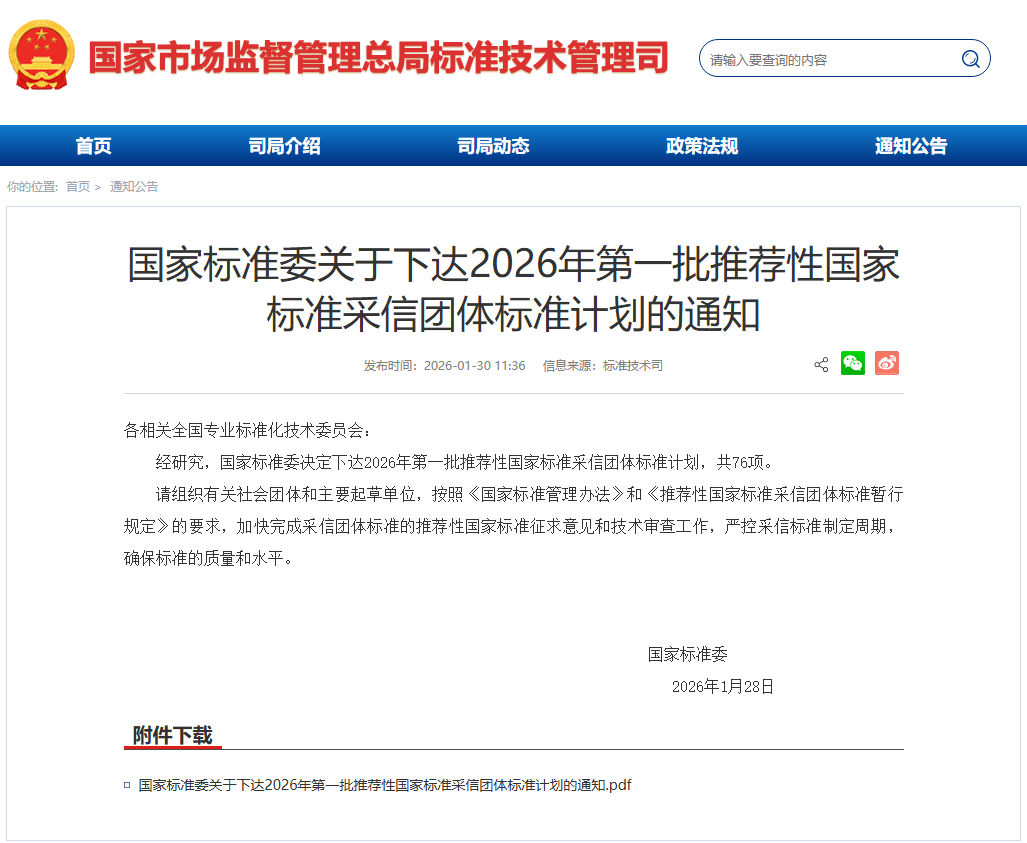 隨著《社會團體登記管理條例》修訂版正式施行,國家標準化管理委員會同步下達《2026年第一批推薦性國家標準采信團體標準計劃》,76項團體標準正式納入推薦性國家標準計劃。